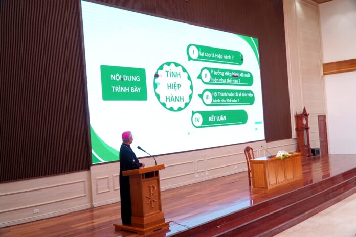 Sau lời phát biểu của Đức cha Anphong, từ 8 giờ 30 phút đến 9 giờ 30 phút, các tham dự viên đã được lắng nghe bài thuyết trình của Đức cha Luy Nguyễn Anh Tuấn về chủ đề: “Kinh nghiệm Hiệp Hành”. Trong đó, Đức cha chủ chăn giáo phận Hà Tĩnh đã gợi mở cho mọi người hiểu biết một cách sâu sắc hơn về những nền tảng thần học của tính hiệp hành trong nhãn quan của Giáo Hội. Bên cạnh đó, Đức cha Luy cũng triển khai những diễn tiến của tính hiệp hành được thể hiện nơi Giáo Hội trong lịch sử, những khó khăn mà Hội Thánh gặp phải trong việc sống và thực hiện hiệp hành, đồng thời đưa ra những giải pháp nhằm giúp cho việc thực hiện hiệp hành được hiệu quả.
